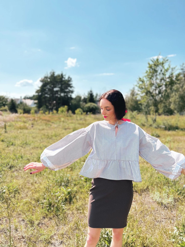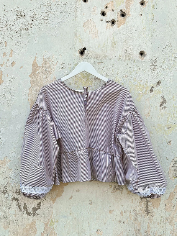 Bluzka damska z bufiastymi rękawami zakończonymi gumką oraz bawełnianą koronką. inspirowana tradycyjnym folklorem, wykonana z bawełnianego kuponu tkaniny z second-handu. Bufiaste rękawy dodają jej unikalnego charakteru, a delikatny wzór w subtelne paski podkreśla jej rustykalny styl. Bluzka posiada luźny krój, idealny na co dzień, zarówno do spódnic, jak i spodni. Zrównoważona moda i oryginalny design sprawiają, że to idealna propozycja dla kobiet ceniących unikatowe, ręcznie tworzone ubrania.